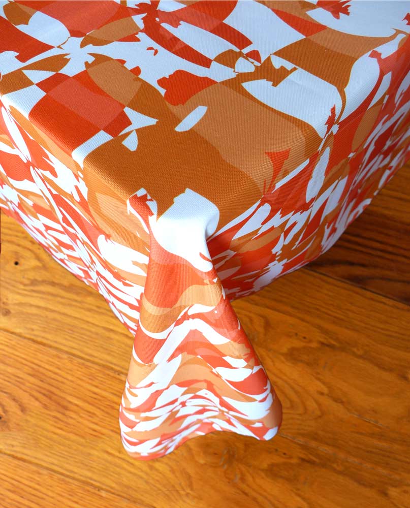 Trois ensembles de formes de couleurs terre, sable et brique s’entrelacent sur un fond blanc. Légèrement transparentes, les teintes se mélangent lorsqu’elles se superposent, créant ainsi un camaïeu riche et chaleureux. Une variation plus dense de ce motif est disponible : Damier Rouge. Nappe imprimée. Disponible en forme carrée ou rectangulaire.